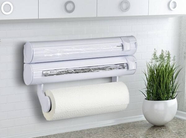 Siempre preparado, de rápido montaje y con un práctico accesorio extra. Así es el portarrollos Rolly Mobil. El portarrollos superior es extraíble de manera que pueda cortar esté donde esté: en la mesa, la despensa o en la barbacoa veraniega en el jardín. Este portarrollos acaba con los extremos arrugados de las hojas. Ambos contenedores de rollos están dotados de afiladas cuchillas especiales. Estas proporcionan unos extremos cortados limpios y además protegen los dedos porque están detrás dentro su elegante desplazador cortador. Una vez cortados, los extremos de los rollos sobresalen lo suficiente como para volver a agarrarlos y estirarlos cuando vuelva a necesitar cortarlos. Rolly Mobil sirve para cualquier tamaño de rollo del mercado. Lleva equipado un tercer soporte para papel de cocina.