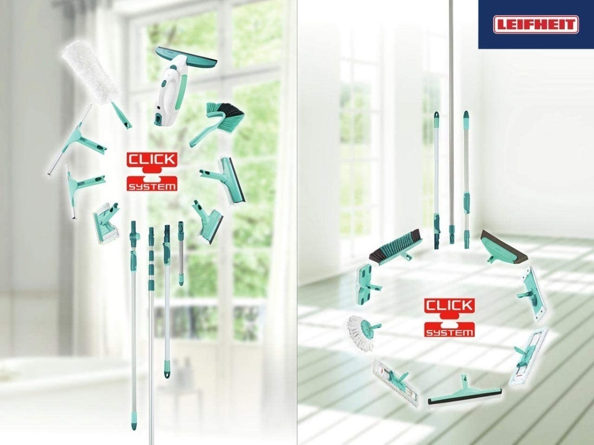 -Sistema de click: la mopa dispone del sistema patentado Leifheit Click: gracias al accesorio especial se pueden utilizar varios dispositivos de limpieza en combinación con el mango.