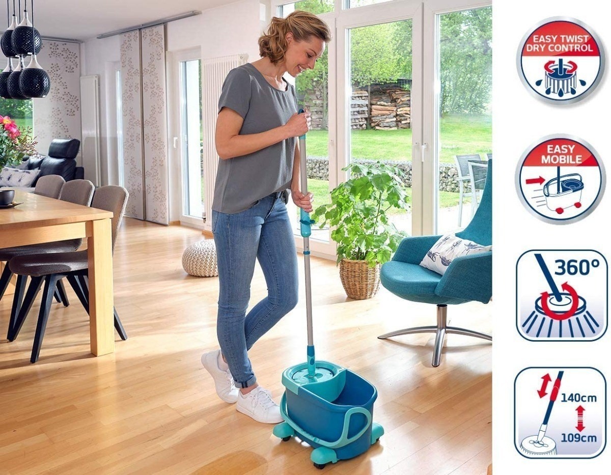 Para todos los que buscan una solución completa para una limpieza cómoda de todos los tipos de suelo: el set Clean Twist Disc Mop Ergo Mobile de Leifheit. Este se compone de un mango telescópico con mecanismo patentado Drill, un cubo de 6 litros con colador centrifugado, una mopa micro duo y un carro de ruedas. El mecanismo patentado Drill en el tallo de la mopa permite centrifugar el agua y la suciedad de forma eficaz. Sin mucho esfuerzo y sin manos en el agua sucia. Para finalizar el proceso de centrifugado, la mopa de Leifheit también dispone de la función de parada de centrifugado. Para ello, solo hay que cerrar la palanca en el mango. Así se puede dosificar fácilmente la humedad de la funda y se puede adaptar fácilmente a los requisitos de cuidado del suelo. El cubo garantiza un centrifugado tranquilo y seguro. Con su articulación de cardán de ángulo de 360 °, es fácil de limpiar en líneas de serpiente – incluso en lugares de difícil acceso como, por ejemplo, muebles. Para una altura de trabajo óptima y respetuosa con la espalda, el mango telescópico del set Clean Twist Disc Mop Ergo Mobile se puede ajustar individualmente a la altura de trabajo óptima (109 – 140 cm). Muy práctico: el carro con ruedas incluido en el set y el soporte de mango integrado en el asa. Así se puede deslizar el cubo durante la limpieza fácilmente con el mopa hacia donde se necesita. A pesar de sus ruedas de 360°, la mopa Clean Twist Disc Mop Ergo Mobile también se mantiene seca durante la fregona. Para un vaciado limpio del cubo, los huecos de agarre en la parte inferior, la boquilla y la amplia apertura en el asa.