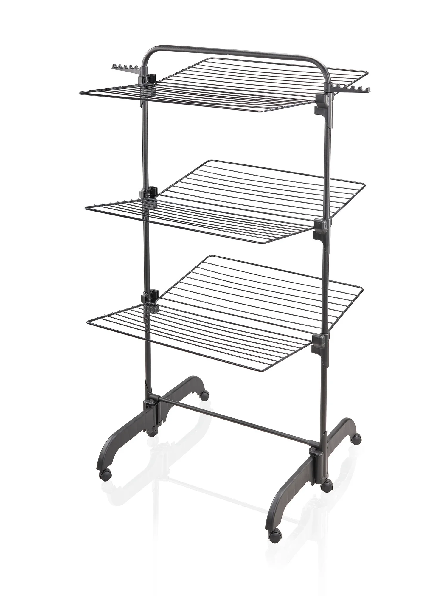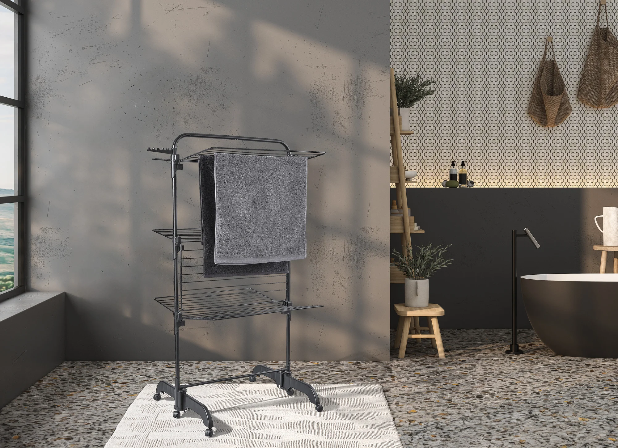Fabricado en acero inoxidable, este tender es resistente y duradero, asegurando un rendimiento excepcional a lo largo del tiempo. Su diseño de pie permite una fácil colocación en diferentes entornos, brindando versatilidad en su uso, ya sea en el interior de la casa o en balcones o patios.